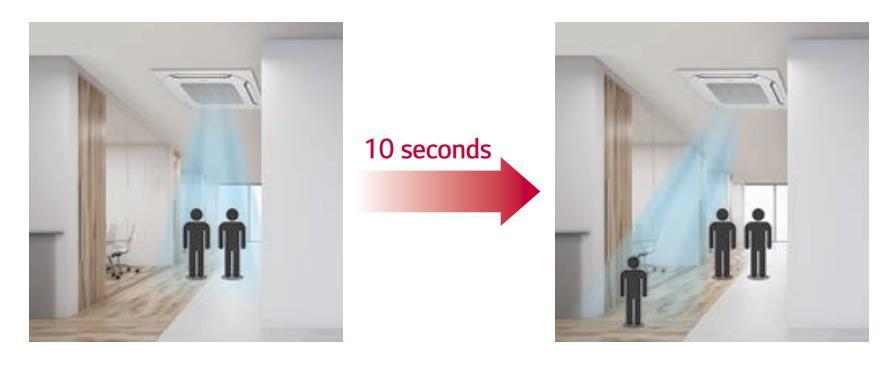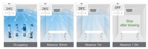 The advanced control options of the LG Ceiling Mounted Cassette series include independent vane operation, which allows users to control the direction of airflow for personalized comfort, and occupancy-based control, where the human detection sensor adjusts airflow direction and temperature based on the activity level and presence of people every 10 seconds.