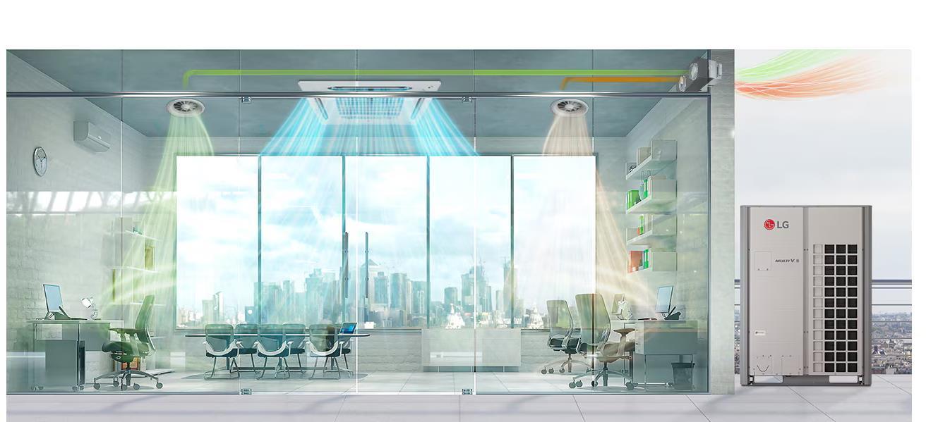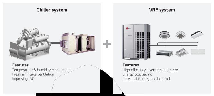 LG AHU has benefits of both chiller system’s AHU and VRF system. Chiller system’s AHU offer temperature & humidity modulation, ventilation through outdoor air intake, air cleanliness through various filter application, and proper air flow for occupants comfort VRF system offers high energy efficiency at partial load using inverter compressor control, energy cost saving, individual control of indoor units, and integrated control of total VRF system.