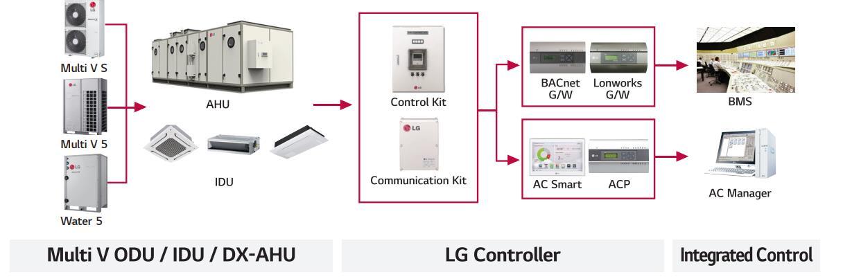 The LG VRF (Variable Refrigerant Flow) central control system provides comprehensive management for various components of an LG air conditioning system, including outdoor units, indoor units, and Direct Expansion Air Handling Units (DX-AHU) This system incorporates three primary controllers: AC Smart, ACP, and AC Manager These controllers facilitate centralized control and monitoring, enhancing the efficiency and effectiveness of HVAC management.