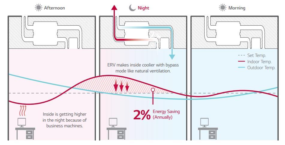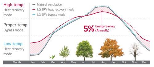The Energy Recovery Ventilation (ERV) system is an advanced solution designed to enhance indoor air quality while maximizing energy efficiency. This system effectively recovers energy from exhausted indoor air and transfers it to the incoming fresh air, ensuring minimal energy loss and maintaining a comfortable indoor environment The LG ERV is capable of interlocking with air conditioning systems and can be controlled individually, allowing for seamless integration and enhanced functionality.