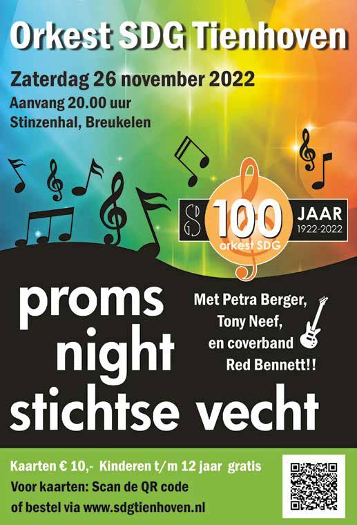 Orkest SDG is natuurlijk al lang geen onbekende meer in de regio en viert dit jaar haar 100-jarig ju bileum. Het fanfareorkest van de Stichtse Vecht verzorgt al een aantal jaren mooie concerten in de theaters van de Stichtse Vecht. Dit jaar wordt alweer de 6de editie van PROMS Night georga niseerd in de Stinzenhal in Breukelen. Elk jaar wordt dit evenement mooier en groter, waarbij wij elke editie honderden enthousiaste bezoe kers kunnen verwelkomen. Kom genieten van onze muziek!