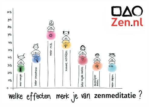 Zentraining kun je vergelijken met hardlooptraining. Je mentale conditie neemt toe en je kunt flexibeler omgaan met wat het leven je brengt. Meer veerkracht maar ook meer genieten. Van dagelijks mediteren merk je vaak al snel de effecten. Mediteren is de tijd nemen om de vele indrukken die we dagelijks opdoen te verwerken.