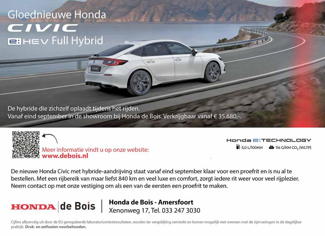 De Honda Civic eHEV staat vanaf september bij Honda de Bois in Amersfoort klaar voor een proefrit. Bekijk nu alvast onze website voor meer informatie en laat uw interesse www.debois.nl/honda-civic-hybrid aan ons we ten. Kom hem als een van de eersten ervaren.