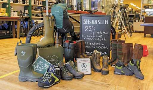 Maar de grootste verbazing is er eigenlijk al bij binnenkomst van de winkel; namelijk een grote afdeling verrekijkers en telescopen. De bijzon dere combinatie is wat de verbazing schetst, maar wel een specialisme welke goed te com bineren is met het schoeisel. Wandelen op perfecte wandelschoenen of laarzen met een verrekijker, brengt je dichter bij de natuur. Ervaar deze beleving! Deskundig advies voor optimaal genieten.