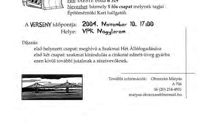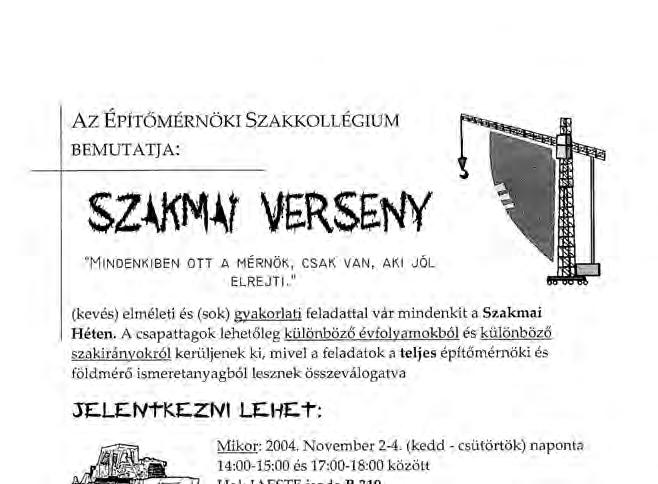 és külföldi projektek, fejlesztések kerülnek terítékre. Szintén a tavaszi félévben kerül hagyományosan megrendezésre a Várostervezési Napok (bővebben a 19. oldalon), amely egy komplex, ötnapos várostervezési műhelyverseny építőmérnök-, közlekedésmérnök-, építész- és tájépítész hallgatóknak. Az őszi félévben kerül megrendezésre az Építőmérnöki Szakmai Hét (bővebben a 18. oldalon) elnevezésű programsorozat, amely során előadások, vetélkedők és különleges tanulmányutak követik egymást.