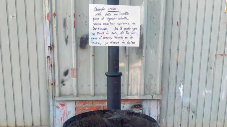 Cansado de la falta de limpieza, un vecino ha decidido tomar cartas en el asunto y ha instalado una bolsa en la calle Dulcinea para el depósito de los excrementos de perro. “No te pido que te lleves la caca de tu perro, pero al menos tírala en la bolsa y yo la tiraré en la basura”, reza el cartel que ha colocado justo encima, en el que asegura que la vía “no existe para el Ayuntamiento” y que son los residentes los que han de encargarse de mantenerla limpia.