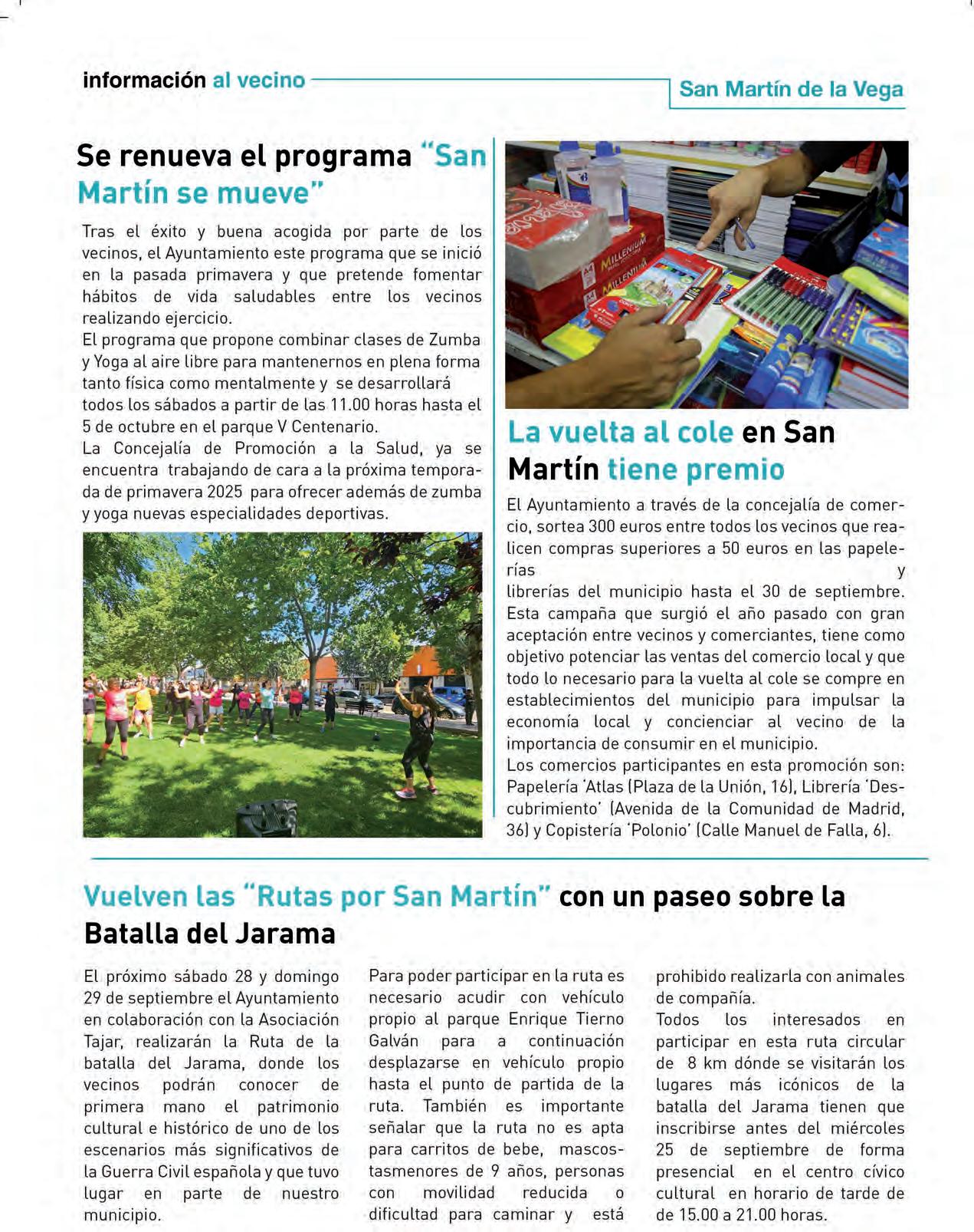 APLAUSOS AL GOBIERNO DE SAN MARTÍN DE LA VEGA POR SUS INICIATIVAS PARA POTENCIAR EL TEJIDO ECONÓMICO DEL MUNICIPIO. En los últimos años, el Ejecutivo ha llevado a cabo numerosas campañas para potenciar las compras en los establecimientos locales, así como para consumir en sus bares y restaurantes. Este mes de septiembre, sin ir más lejos, los vecinos podrán ganar 300 euros por comprar en papelerías sanmartineras con motivo de ‘la vuelta al cole’ y disfrutar de una feria gastronómica con pinchos a precios populares. Iniciativas con las que todos ganan y que son, además, una apuesta de futuro (págs. 18).