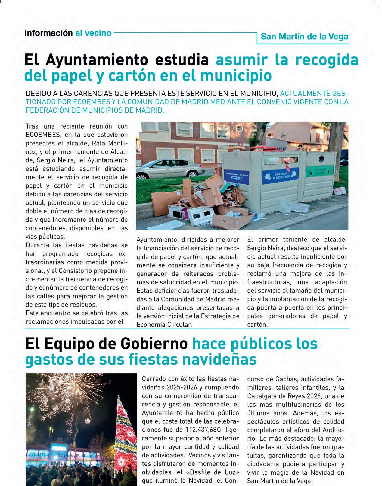 ABUCHEOS A ECOEMBES por un servicio de recogida de papel y cartón claramente insuficiente para un municipio como San Martín de la Vega. La escasa frecuencia, la falta de contenedores y una financiación que la propia entidad reconoce como deficiente han derivado en una insostenible situación que ha llevado al Gobierno local a valorar la posibilidad de asumir el servicio. Se trata, además, de una problemática que se repite en prácticamente todas las ciudades del territorio nacional sin que desde la administración pública competente se tome medida alguna para solucionarla.