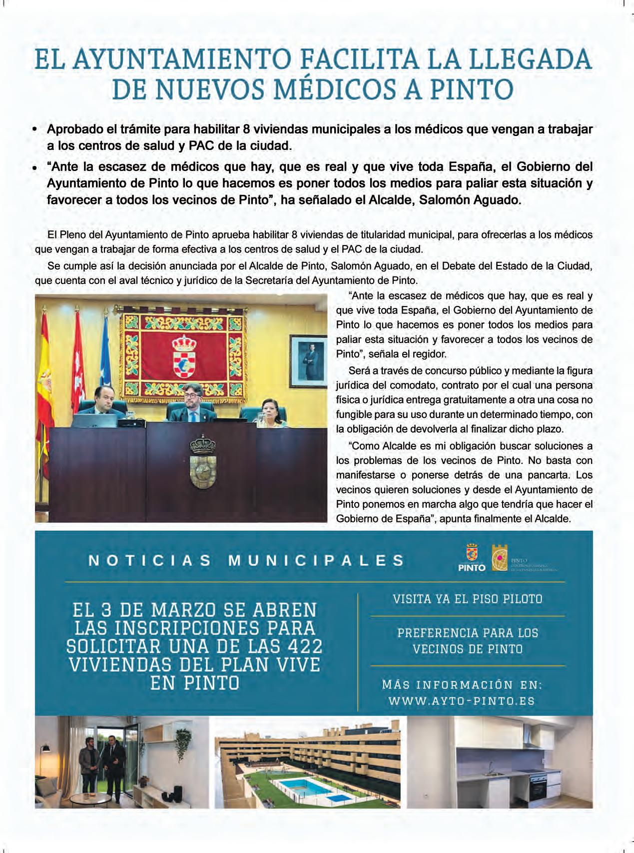 El Plan Vive llega a Pinto. El 2 de febrero, el consejero de Vivienda, Transportes e Infraestructuras, Jorge Rodrigo, junto con una comitiva municipal encabezada por el alcalde, Salomón Aguado, ha visitado la urbanización en la que se encuentran las 422 viviendas de alquiler a precios asequibles construidas por la Comunidad de Madrid. A solo tres meses de que estén completamente terminadas, ya se conocen todos los detalles del proceso de adjudicación que está previsto que concluya en abril. “Pinto está de moda”, destacó Aguado desde uno de los áticos de la promoción.