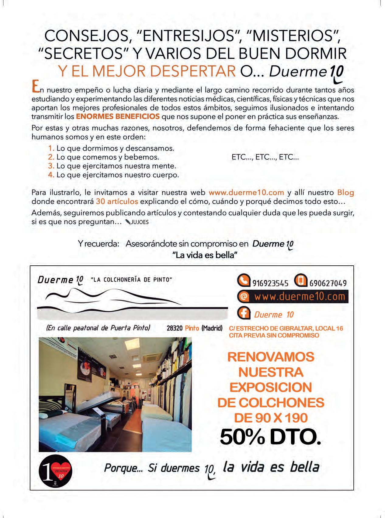 APLAUSOS A LA ASOCIACIÓN ESPAÑOLA CONTRA EL CÁNCER DE PINTO que, por cuarto año consecutivo, celebrará su Marcha Contra el Cáncer Infantil. La prueba se ha convertido en una de las más importantes del calendario local y pretende alcanzar en esta ocasión la cifra de 3.000 corredores. El trabajo constante de sus miembros ha conseguido que la marcha sea un éxito de participación y que, además, tenga un impacto real en un colectivo tan vulnerable como es al que se dirigen (pág. 22).