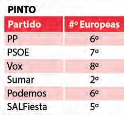 La cuarta posición fue para Sumar con 1.500 votos (7,13%) seguido por Se Acabó La Fiesta, la otra opción de ultraderecha y sorpresa en estas elecciones que rascó 1.354 votos en el municipio (6,43%). Podemos tuvo que conformarse con 946 respaldos (4,49%), 2.521 menos que en 2019, en lo que fue el gran descalabro de la noche junto con Ciudadanos, al que sólo apoyaron 169 pinteños (0,8%).