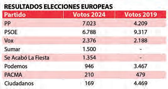 respecto a los últimos comicios. Únicamente otra de las grandes formaciones de nuestro país consiguió crecer, Vox, con 2.376 votos (11,29%), que son 188 más que los recabados en las europeas de hace cinco años. La formación de ultraderecha acabó tercera en el municipio por detrás del PSOE, que perdió 2.529 apoyos hasta sumar un total de 6.788 (32,27%).