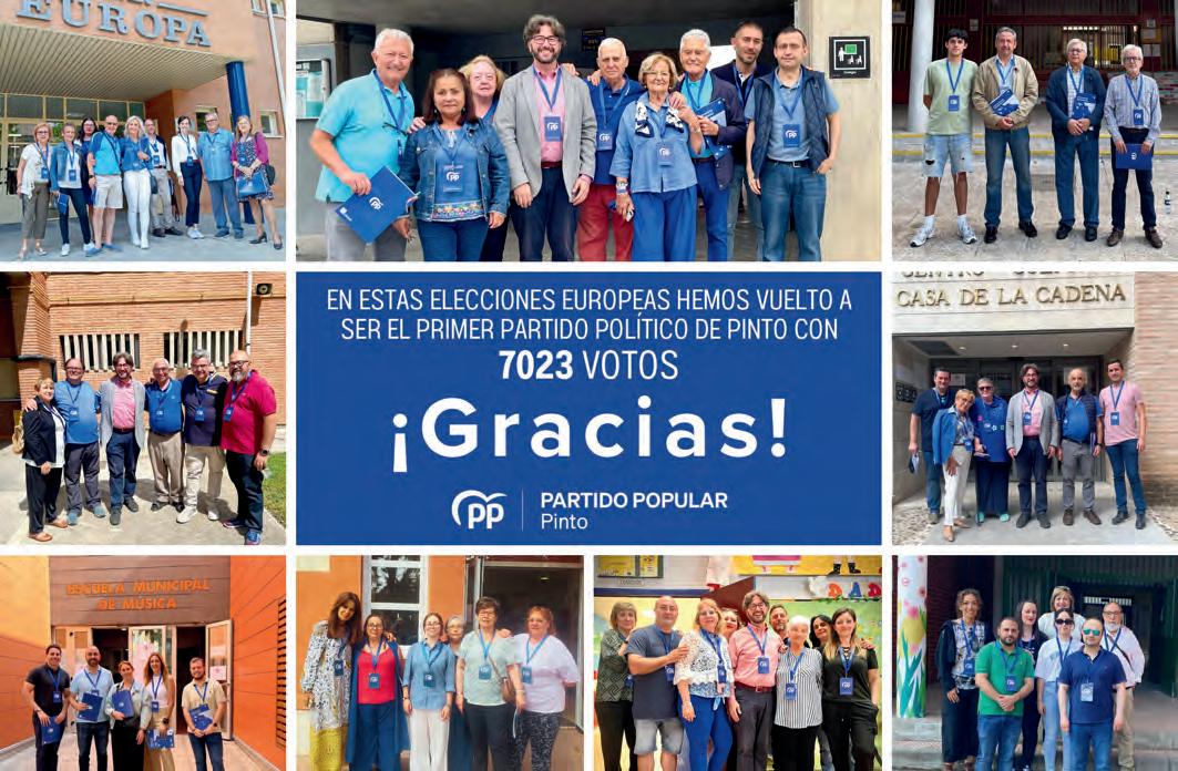 Popular en las elecciones al Parlamento Europeo celebradas el pasado 9 de junio también se trasladó a Pinto. Los populares consiguieron mejorar de manera significativa los resultados de 2019 en el municipio y llevarse la victoria con un 33,39% de los votos emitidos, poco más de un punto respecto a los socialistas (32,27%). A nivel nacional, PP obtuvo 22 escaños, superando a PSOE (20 escaños), Vox (6), Ahora Repúblicas (3), Sumar (3), Se Acabó La Fiesta (3), Podemos (2), Junts-UE (1) y CEUS (1).