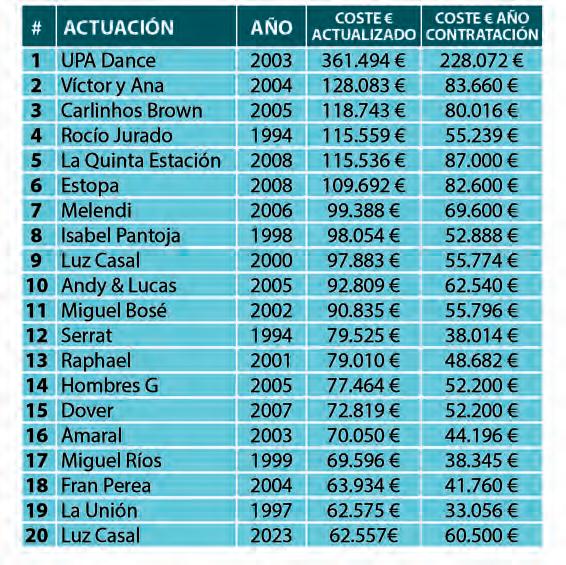 El concierto de UPA Dance del año 2003 se mantiene como líder indiscutible del ranking: su contratación costó 361.494 euros de hoy a las arcas municipales, por encima del presupuesto total para las fiestas patronales de 2019 y 2022. Únicamente un artista aparece en dos ocasiones entre las 20 actuaciones