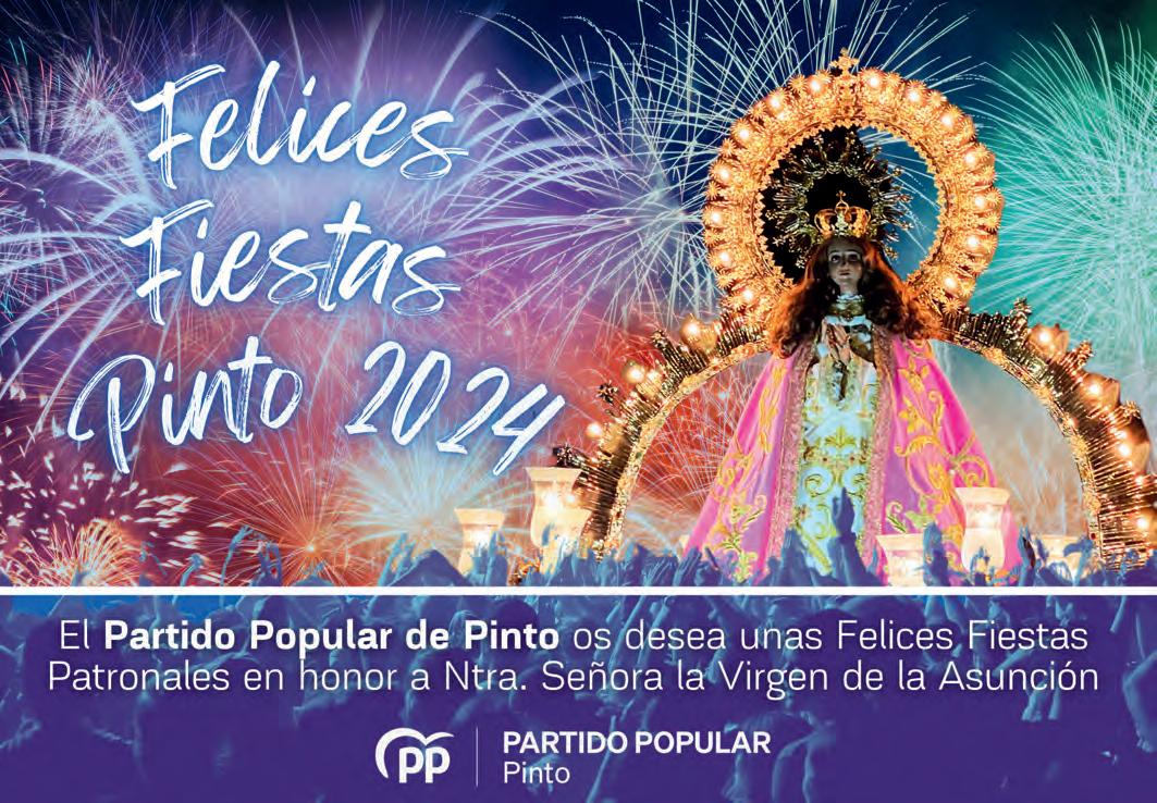 Del 9 al 12 de agosto tendrán lugar las Fiestas Patronales de Pinto en honor a Nuestra Señora la Virgen de la Asunción de 2024. Días durante los que el municipio se engalanará un año más y que supondrán los primeros festejos enteramente organizados por el Gobierno de coalición de Partido Popular y Pinto Avanza. De momento, se desconoce la cuantía final de estas fiestas y si el presupuesto acabará superando al destinado en 2023, cuando alcanzó los 425.626 euros.
