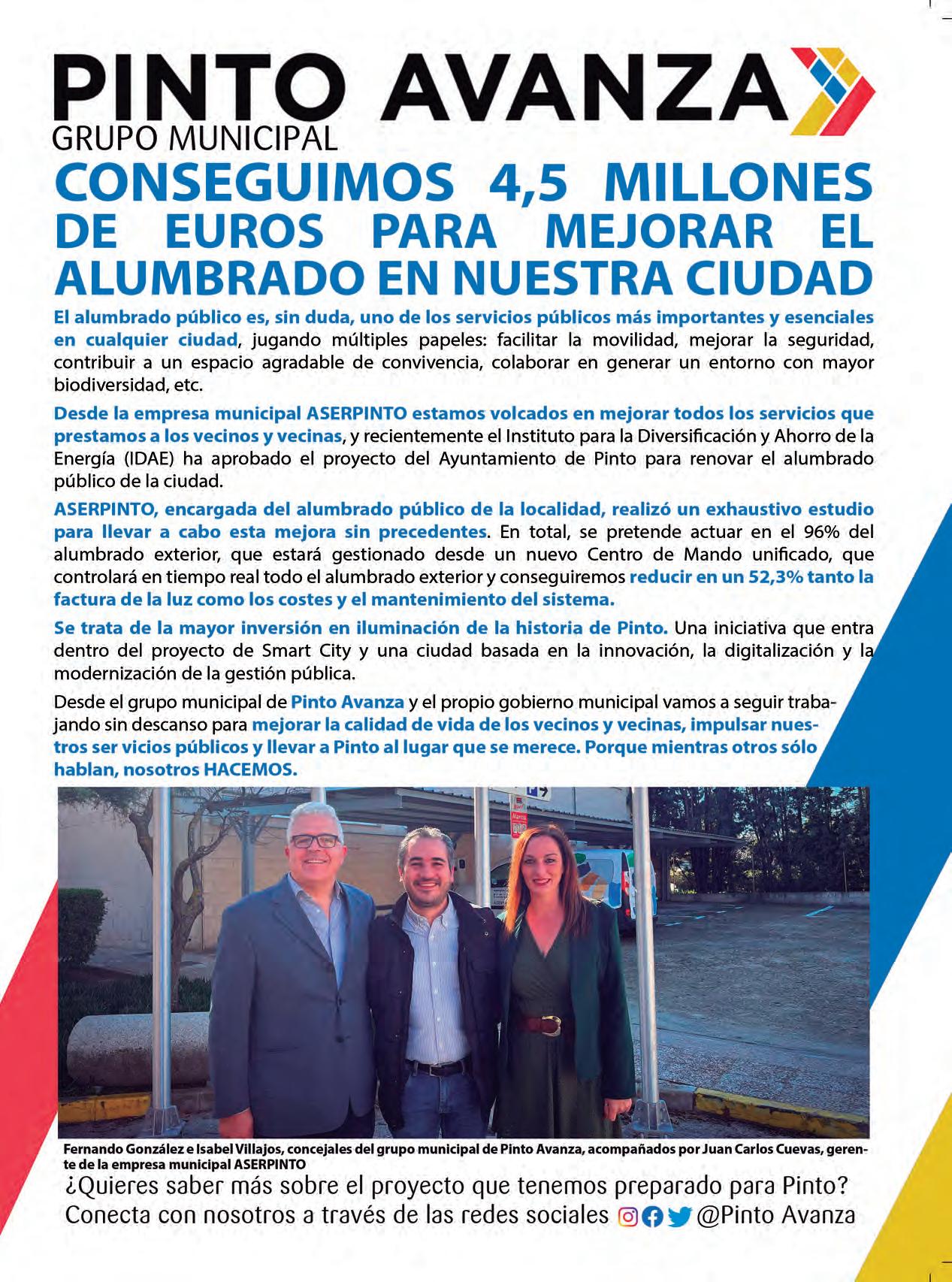 ABUCHEOS AL GOBIERNO POR UNA PRÁCTICA QUE SE REPITE MANDATO TRAS MANDATO: EL USO PARTIDISTA DE LA REVISTA MUNICIPAL. Cumplidos los dos primeros años de PP y Pinto Avanza, la revista municipal recoge durante 13 páginas –con portada incluida– todos los logros conseguidos hasta el momento. Los números están, aun con todo, lejos de los de sus predecesores: en 2023, PSOE, Unidas Pinto y Podemos dedicaron íntegramente un número especial de 64 páginas para resumir su acción de gobierno. Publicidad pagada con el dinero de todos que los partidos critican en oposición y replican al hacerse con el bastón de mando.