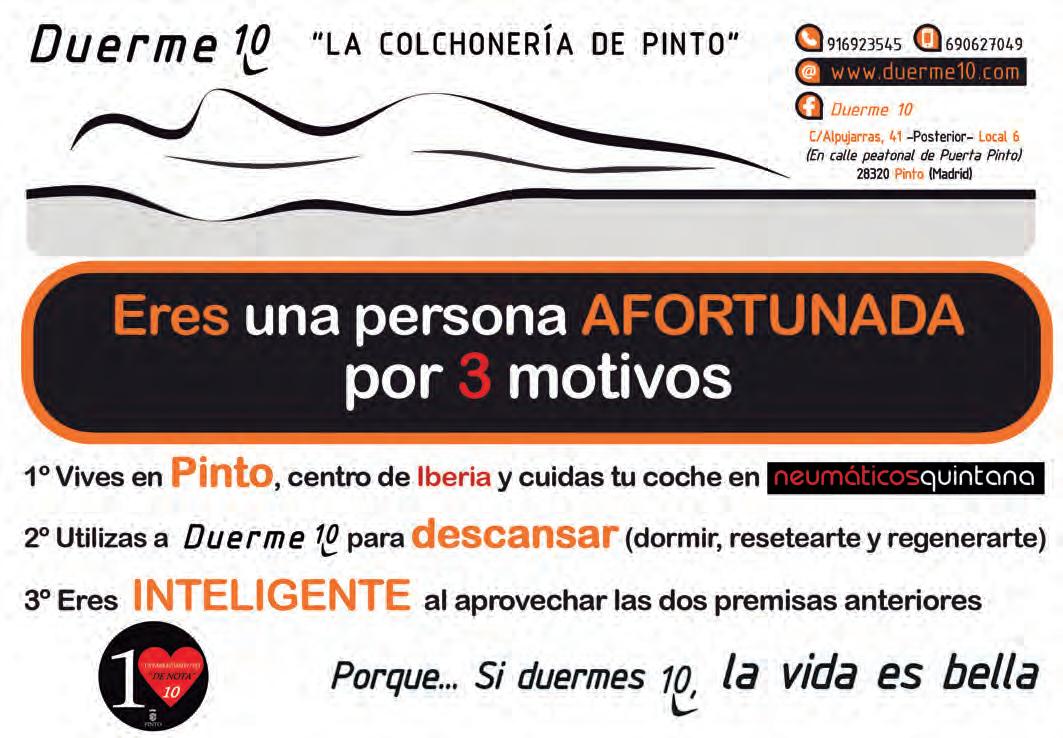 APLAUSOS AL DEPORTE PINTEÑO, que ha sido reconocido nuevamente por distintas federaciones en base tanto por la implicación de los clubes y deportistas locales como por la buena organización de grandes eventos de la que también es partícipe el Ayuntamiento de Pinto. Así, en las últimas semanas han sido galardonados el Club Balonmano Pinto, Pintobasket y varios deportistas y dirigentes pinteños por su trayectoria y contribución a sus disciplinas. El deporte local, además de pasear como ningún otro el nombre de Pinto por todo el mundo, vuelve a consolidarse como dinamizador y transmisor de valores fundamentales como son el respeto, el esfuerzo, la superación y el trabajo en equipo (pág. 28).
