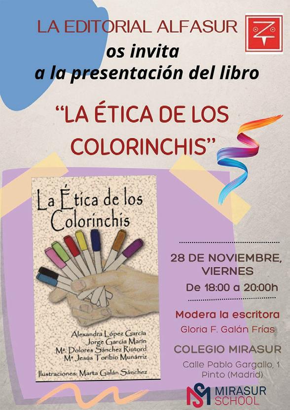 El 28 de noviembre, a las 18 horas, en el salón de actos del Colegio Mirasur (c/ Pablo Gargallo, 1. Pinto) tendrá lugar la presentación del libro ‘La ética de los colorinchis’, de cuatro autores noveles: Alexandra López, Jorge García, Mª