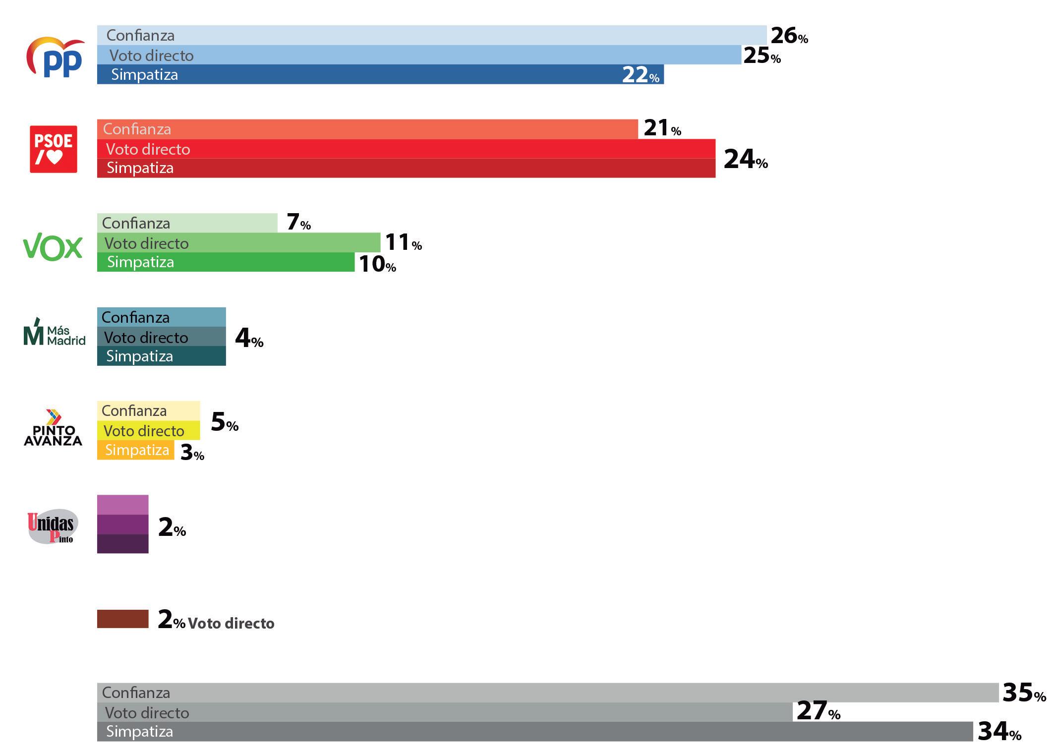2. El Partido Popular es el partido que inspira más confianza para gobernar Pinto. Es también el que acapara más intención de voto, aunque no llega a la mayoría absoluta.