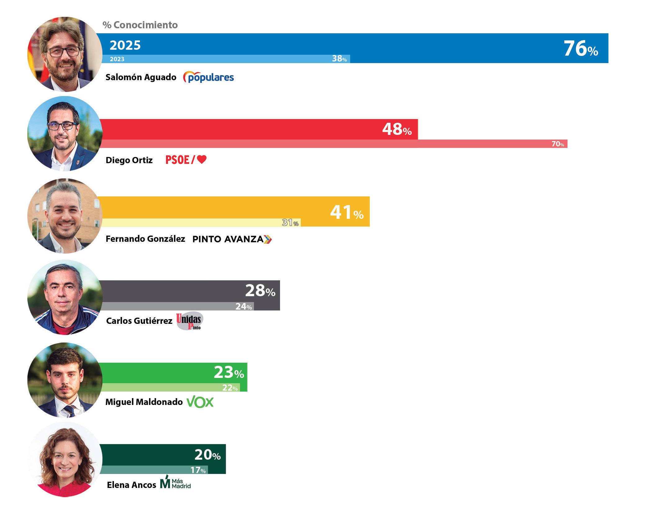 Aunque los líderes de los dos partidos del Gobierno, el alcalde Salomón Aguado y el segundo teniente de alcalde Fernando González, son los dos políticos mejor valorados de la corporación pinteña, curiosamente el grupo que más crece es el del portavoz con peor puntuación. Ese es Miguel Maldonado, de Vox, que es conocido por sólo dos de cada diez vecinos y cuya nota es de apenas un 2,7. Sin embargo, la horquilla de ZIG-