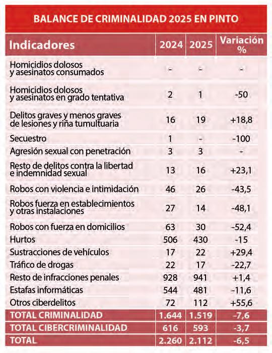 El tercer trimestre de 2025 acabó en Pinto con una reducción del 6,5% en el conjunto de infracciones penales, según el último Balance de Criminalidad elaborado por el Ministerio del Interior. En concreto, se cometieron 2.112 delitos frente a los 2.260 en el mismo periodo del año anterior.