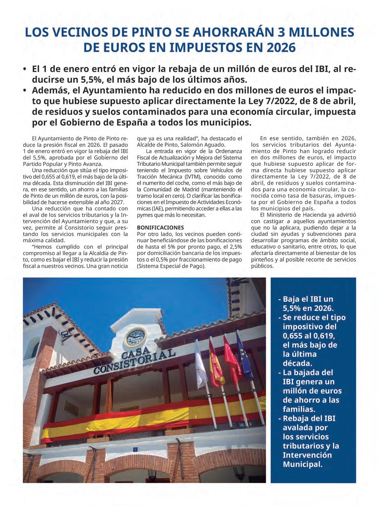 De cara a 2026, el alcalde de Pinto, Salomón Aguado, ha anunciado que el Gobierno local propondrá una rebaja del 30% en esta tasa. Así lo avanzó en una entrevista en la Cadena SER, emitida el pasado 22 de diciembre. La medida supondrá que el Consistorio deje de recaudar en torno a dos millones de euros. Aguado aseguró que el objetivo es “reformar y adaptar esa tasa