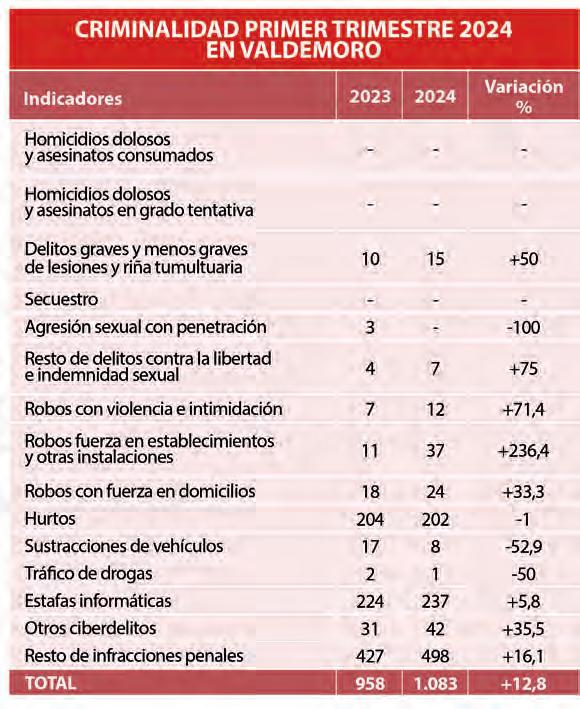 Alo largo de 2023, Valdemoro experimentó un importante aumento de la delincuencia. La localidad pasó de ocupar el puesto 18 al 11 en el ranking de las ciudades más inseguras de la Comunidad de Madrid. Un dato que ha empeorado según el último Balance de Criminalidad del Ministerio del Interior, que ha colocado a Valdemoro entre las diez localidades de más de 20.000 habitantes de la región con mayor tasa de criminalidad. En concreto, Valdemoro ostenta el décimo índice más alto con 13,3 delitos por habitante cometidos en los tres primeros meses del año. La tasa de criminalidad valdemoreña se encuentra por debajo de la media española (12,6),