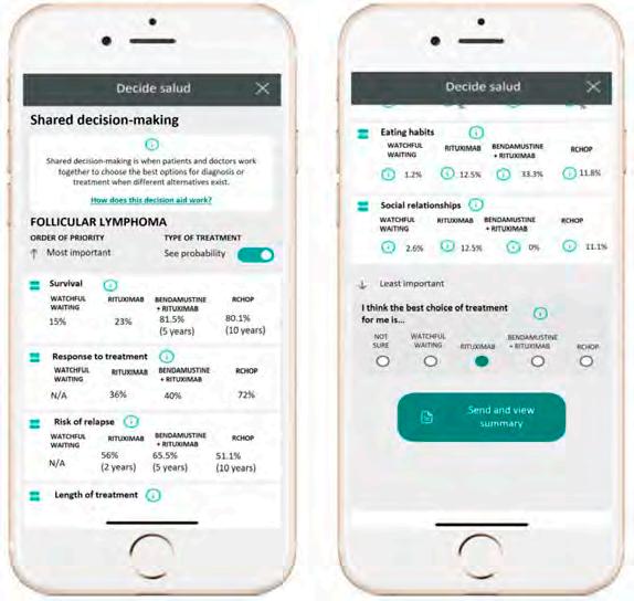 Posteriormente, y a través de la citada aplicación, el paciente recibe la información sobre las características, resultados deseables y posibles efectos de las distintas opciones terapéuticas para sopesarlas y asignar un orden personal de prioridad a estos datos, así como cuestionarios que su equipo clínico ha diseñado expresamente para ellos sobre sus hábitos de vida, percepción de síntomas, estado emocional o valores. El análisis conjunto de la información clínica y la obtenida de los cuestionarios, que permite identificar a qué aspectos dan más importancia, tanto de los resultados como de su tolerancia a los posibles efectos, “cierra el círculo” entre la recopilación de información de salud y de datos informados por los pacientes y el proceso de toma de decisiones.
