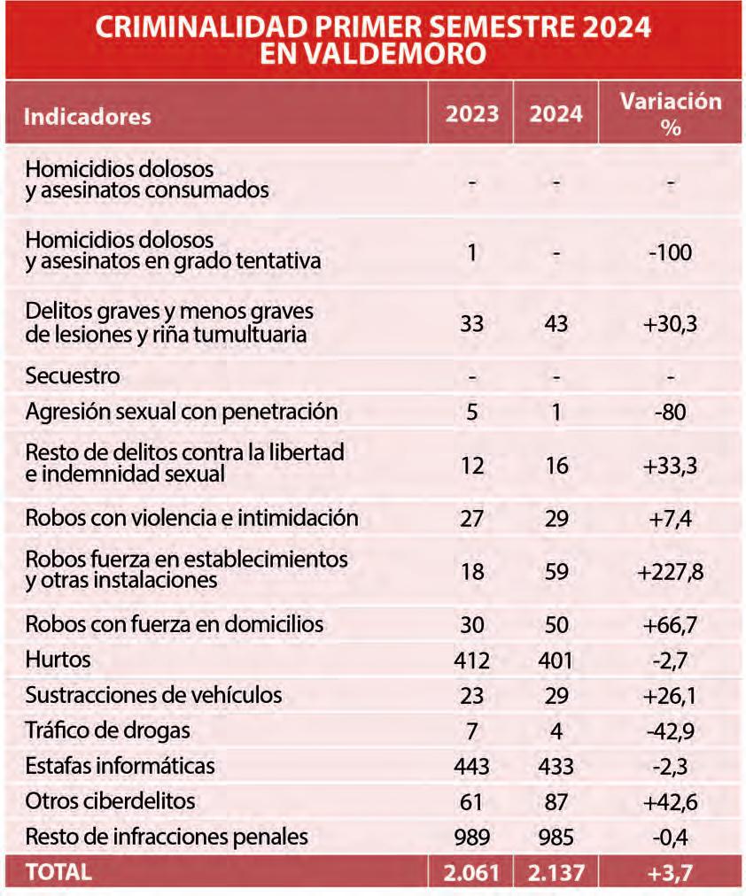 Valdemoro sigue entre los primeros puestos del ranking de criminalidad de la Comunidad de Madrid. Con una tasa de delincuencia de 26,2 delitos por cada mil habitantes, es la novena localidad de más de 20.000 habitantes de la región en la que se producen más infracciones penales. Su media se encuentra por debajo de la de Comunidad de Madrid (29,2), pero por encima de la del resto de España (25,4). Es la principal conclusión de la última actualización del Balance de Criminalidad del Ministerio del Interior. Entre enero y junio de 2024 se cometieron 2.137 hechos frente a los 2.061 que constataron los Cuerpos y Fuerzas de Seguridad del Estado durante el mismo periodo del año pasado (+3,7%). El 24% de las infracciones estuvieron relacionadas con la cibercriminalidad, que experimentó un crecimiento del 3,2% frente al 3,9% que
