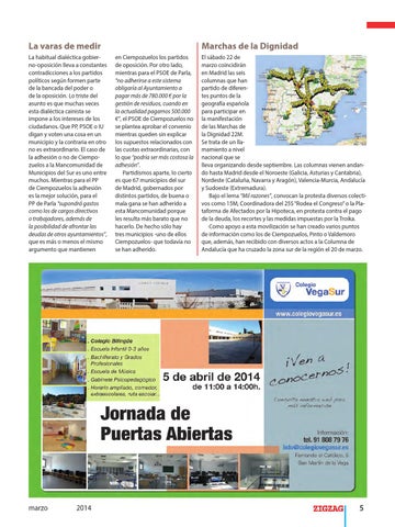 Marchas de la Dignidad en Ciempozuelos los partidos de oposición. Por otro lado, mientras para el PSOE de Parla, “no adherirse a este sistema obligaría al Ayuntamiento a pagar más de 780.000 € por la gestión de residuos, cuando en la actualidad pagamos 500.000 €”, el PSOE de Ciempozuelos no se plantea aprobar el convenio mientras queden sin explicar los supuestos relacionados con las cuotas extraordinarias, con lo que “podría ser más costosa la adhesión”. Partidismos aparte, lo cierto es que 67 municipios del sur de Madrid, gobernados por distintos partidos, de buena o mala gana se han adherido a esta Mancomunidad porque les resulta más barato que no hacerlo. De hecho sólo hay tres municipios -uno de ellos Ciempozuelos- que todavía no se han adherido.