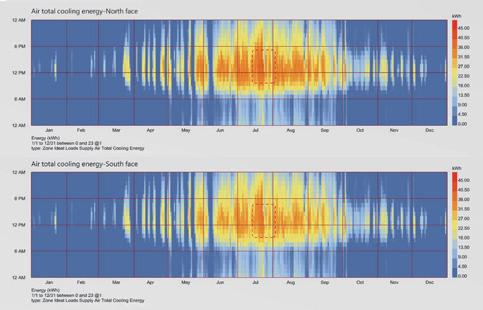 The maximum solar radiation value for the whole year is 913kWh/m2 and the areas with high radiation values are the roof and part of the south-western façade. This indicates that the building has the potential to capture passive solar energy on the roof, while the overheating of the south façade also needs to be considered. In winter, the solar radiation values of the flat roof are lower than those of the south façade, due to the lower solar altitude angle. Therefore, the tilt angle should be taken into account when placing PV panels on the roof.