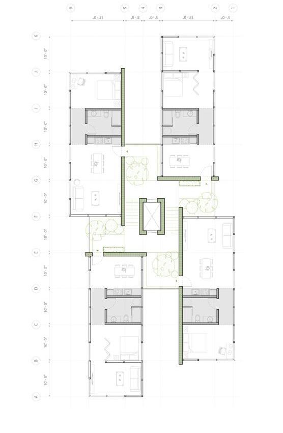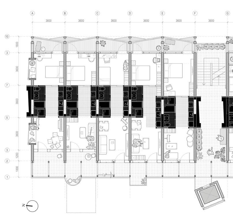 In buildings of all sizes, the first and second floors are used as shopping malls. The third floors and fourth floors serve as community gatherings and the top floor serves as multigenerational housing.