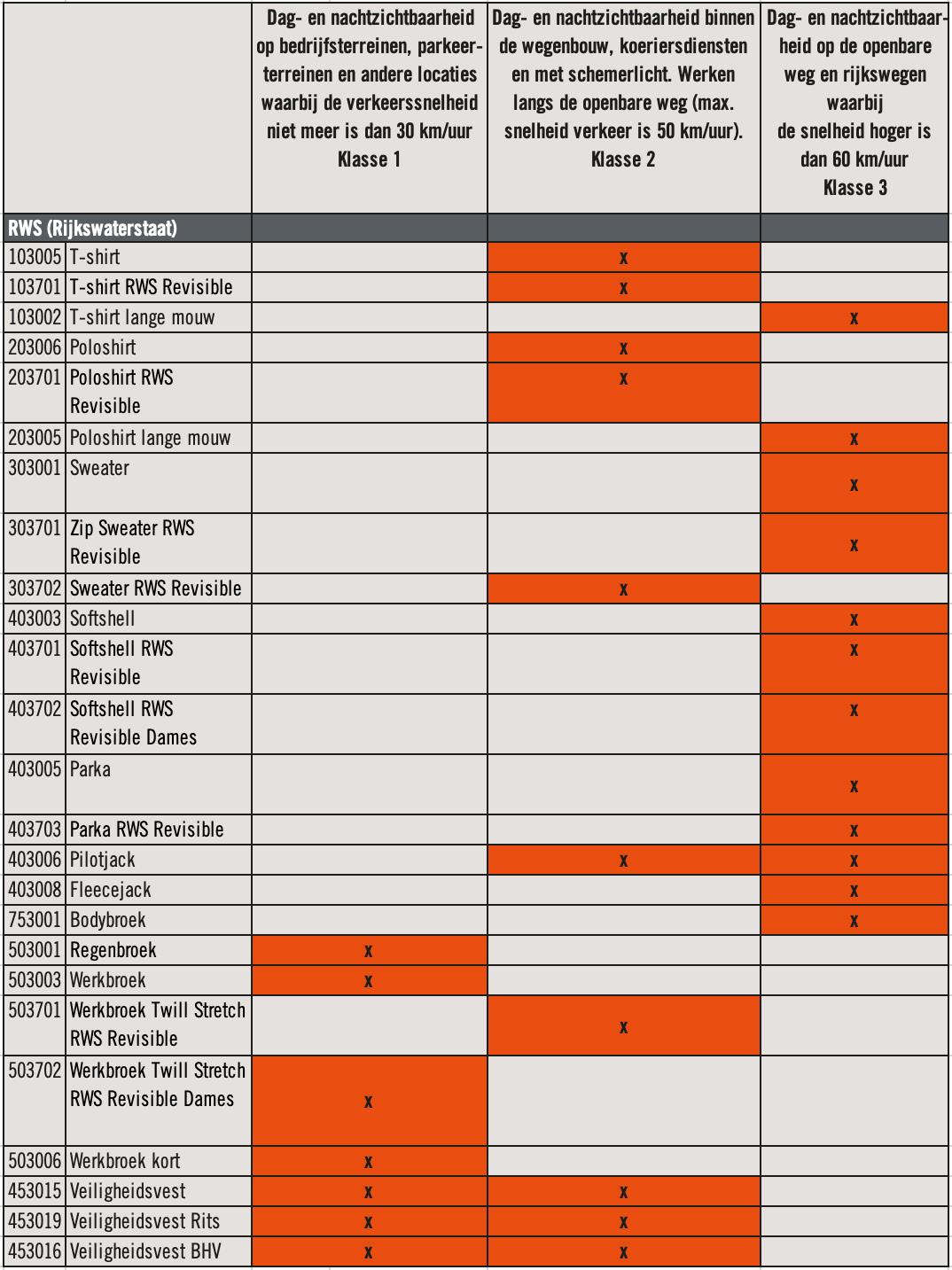 Normering voor hoge zichtbaarheid. Deze kleding biedt bescherming tegen het risico onopgemerkt te zijn, zowel bij daglicht als in het donker, onder verlichting van koplampen van motorvoertuigen. De x-waarde geeft aan in welke klasse een product valt op basis van de totale oppervlakte van het fluoriserend en reflecterend materiaal. De klasse kan 1, 2 of 3 zijn, waarbij 3 de hoogste is.