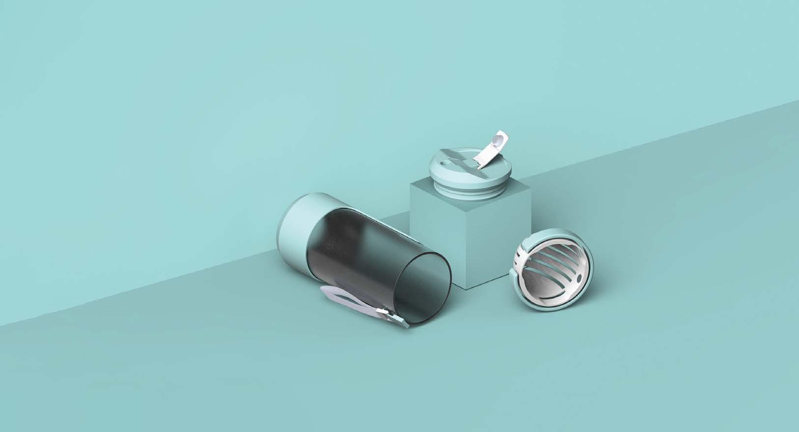 內部磁吸濾網裝載果料,在不同飲品中,運用C 型環改變上下位置,使用者能更好 進行飲用,飲品果料可完全浸泡到茶水,飲用口內削設計,符合嘴型貼合飲用