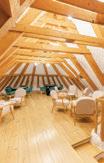 Unitățile de cazare sunt amenajate în corpuri volumetrice distincte de zonele comune cu gabarite și detalii specifice locuințelor din zonă. Un număr de 11 camere duble și un apartament pot adăposti, în total, 37 de oaspeți. Fiecare cameră are o terasă, iar în interior, vestibul, baie și spațiu de dormit, amenajate într-un reconfortant minimalism cu rezonanță locală. În ceea ce privește materialele folosite în amenajarea interioară, acestea reiau temele și contrastele regăsite în spațiul exterior. Contrastul albalbastru, plasticitatea pereților, texturile și căldura lemnului natur sunt îmbinate cu elementele textile alb sau crem cu motive tradiționale. Dotările moderne completează arhitectura autentică, oferind un bun punct de pornire în explorarea peisajului Deltei Dunării.