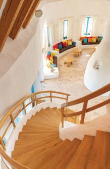 Imaginea generală este marcată de contrastul dintre albul strălucitor al pereților și culoarea albastru folosită la elementele de lemn ale tâmplăriei și structurii aparente a pridvoarelor. Finisajul exterior al clădirilor este unul tradițional pentru acest tip de structură, o tencuială din lut cu spoială de var. Textura mai rugoasă și nuanța maronie a registrului superior marchează și scoate în evidență scara la care sunt construite casele. Ansamblul de volume adăpostește atât spații de cazare a oaspeților, cât și spații comune, un restaurant, spații pentru personal și un foișor. Punctul central al compoziției volumelor este construcția ce adăpostește zona de relaxare. Cu un element central vertical, vatra ce dă căldură și reunește oaspeții în jurul ei, camera de zi este deschisă către restul funcțiunilor comune și camera de jocuri de la etaj.