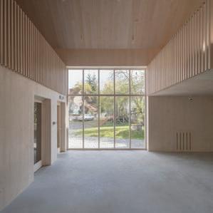 din șură, completată cu material lemnos vechi din alte surse. Învelișul clădirii este dublat pe interior cu un placaj de lemn, cu un limbaj reținut, punând accentul pe spațialitate și pe dialogul dintre cele două coji: una exterioară, tradițională, și cea interioară, contemporană. Aceste coji se ating sau se desprind, dând prilejul de a vedea sau a intra în spațiul dintre ele.