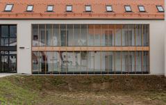 La fel de bogată este compoziția fațadelor vizibile dinspre spațiul public: sunt evitate suprafețele mari, uniforme, de fațadă prin inserții de finisaje de lemn, pentru a reflecta ritmul formal general al peisajului cultural din jur.