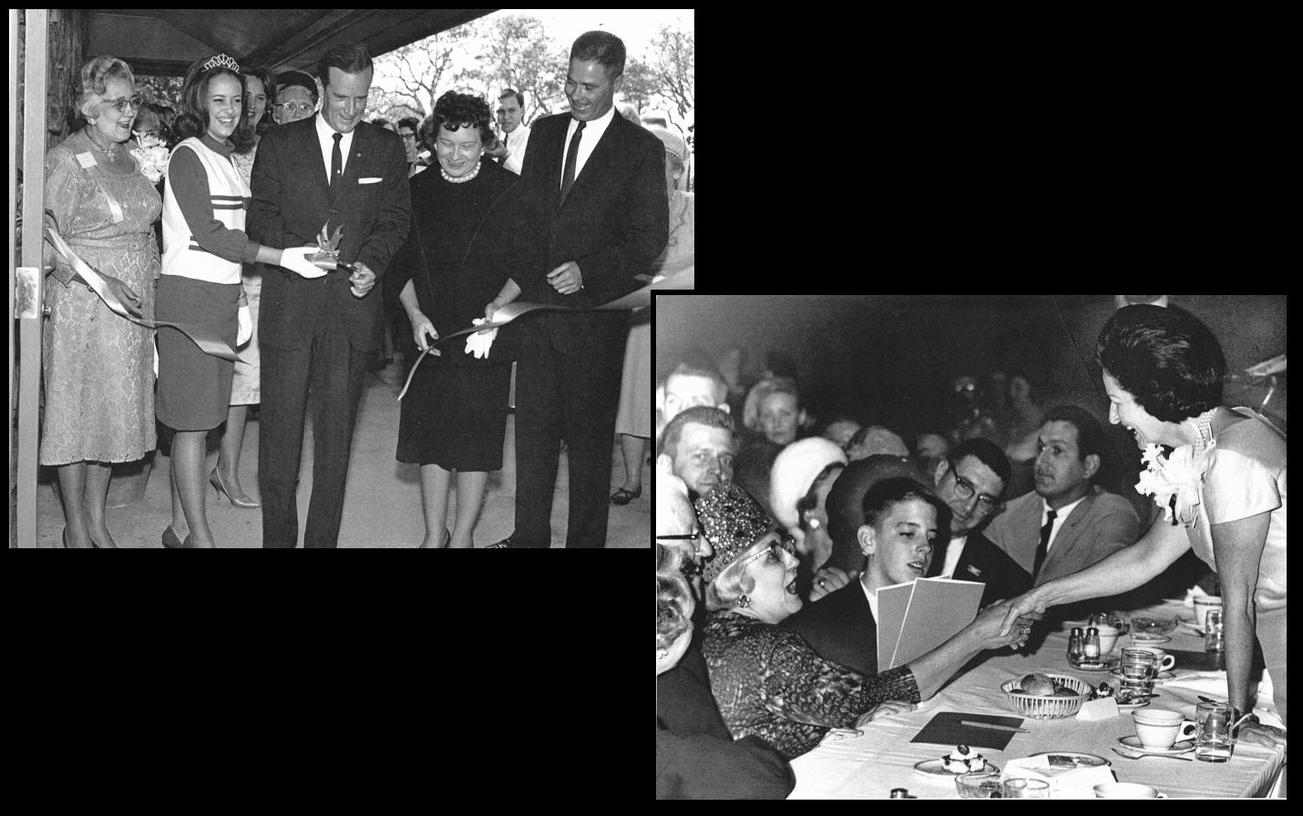 (Left) 1964 ribbon cutting with AAGC members and Austin Mayor. (Below) 2023 planning meeting onsite for ZBGC lead Butler Window restoration project.