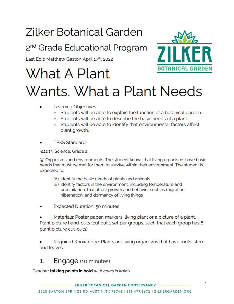 Self-guided tours are offered to school groups and community members. In 2022, the Conservancy began developing downloadable lesson plans and activity guides like the ones shown, which are free to access at zilkergarden.org.