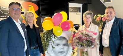 Hübsch dekorierte Stehtische am Eingangsbereich ihres Gebäudes in der Kreuzlau, versehen mit weißen Tischtüchern und frischen, orangefarbenen Rosen – dem runden „Geburtstag“ zu-