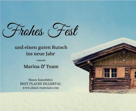74 50 | 2022 ZILLERTALER HEIMATSTIMME INSERATE 4 01+02 INSERATE 2021 remax-immopartner.at ANDREA EBNER +43 676 33 06 903 ae@remax-immopartner.at wünscht Ihnen zauberhafte Weihnachten und einen guten Rutsch. Ihre Immobilie. In besten Händen. REMAX_Inserat Titelmodul_Andrea_Zillertaler Nachrichten_96,5x66mm_011222_RZ_Coated FROGA39.indd 1 01.12.22 10:51 Liebe Kunden und Geschäftspartner, am Ende dieses Jahres sagen wir DANKE für die gute Zusammenarbeit und das entgegengebrachte Vertrauen. Wir wünschen euch schöne Weihnachten. Maurerpartie/Maurervorarbeiter Sehr gute Bezahlung über Kollektivvertragist selbstverständlich! Bewerbung per E-Mail oder Telefon Baumeister Klaus Hauser | 6277 Zellberg 191 | 0676/7495636 | www.h-bau.at| info@h-bau.at Weihnachten