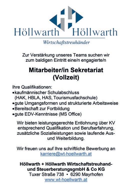 Wenn DU (m/w/d) ab sofort unser Team verstärken willst ... bei der Reinigung unserer Apartments bei flexibler Zeiteinteilung (Vollzeit/Teilzeit/Mini-Job) bei überdurchschnittlicher Bezahlung ... dann komm zu uns Apart Mountainlodge Mayrhofen Tuxer Straße 727, Mayrhofen T 05285 62489 Wir KAUFEN - VERMITTELN Ihr Auto Andreas Kleemaier Tel. 05282 5746-23 oder 0650 8881181 handel@larl.at Nutzen Sie unsere Reichweite für Ihre Werbung! Wir informieren Sie gerne - Anfragen an anzeigen@zillertalerheimatstimme.at oder telefonisch unter 05285 62000 22 Auch im Jahr 2023 erscheinen wieder 12 GRATIS SONDERAUSGABEN der Zillertaler Heimatstimme. Mit einer Auflage von 17.000 Stück erreichen wir jeden ersten Freitag im Monat jeden Zillertaler Haushalt. Geplante Schwerpunkt-Themen sowie aktuelle Infos finden Sie unter: www.zillertalerheimatstimme.at 12 mal Werbevorteil nutzen!