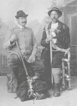 Kellnerin zu mir, ein artiges, hübsches Mädchen. Sie erzählte von den fremden Herren mit den dünnen Beinen und den ungeheuren Bergstöcken und mit den Lorgnetten (Brille mit zwei Gläsern und einem Haltegriff ) die Berge angucken, aber nicht hinaufsteigen, und von den Damen, deren Krinolinen (Reifröcke) so groß waren, dass sie kaum im engen Tal Platz fanden. Dabei lachte sie aus vollem Hals über diese drolligen Enthusiasten, welche jede Ziege für eine Gämse hielten.“