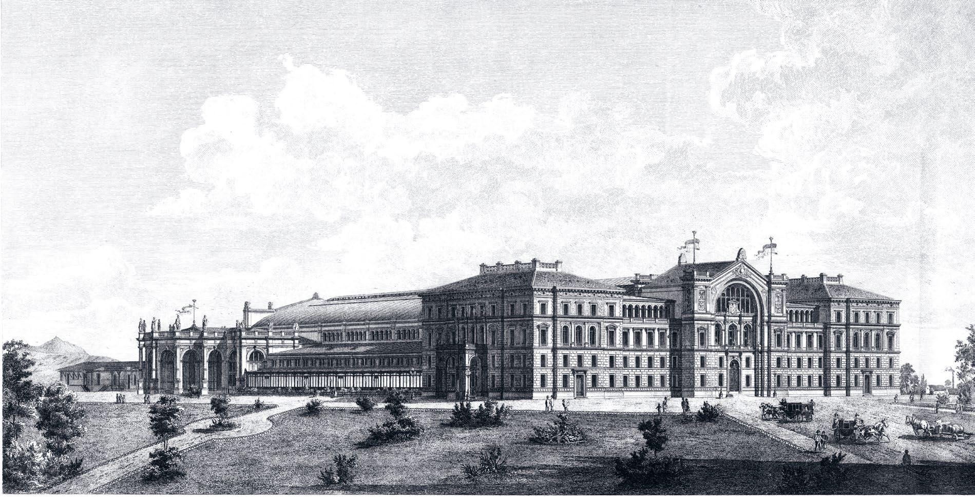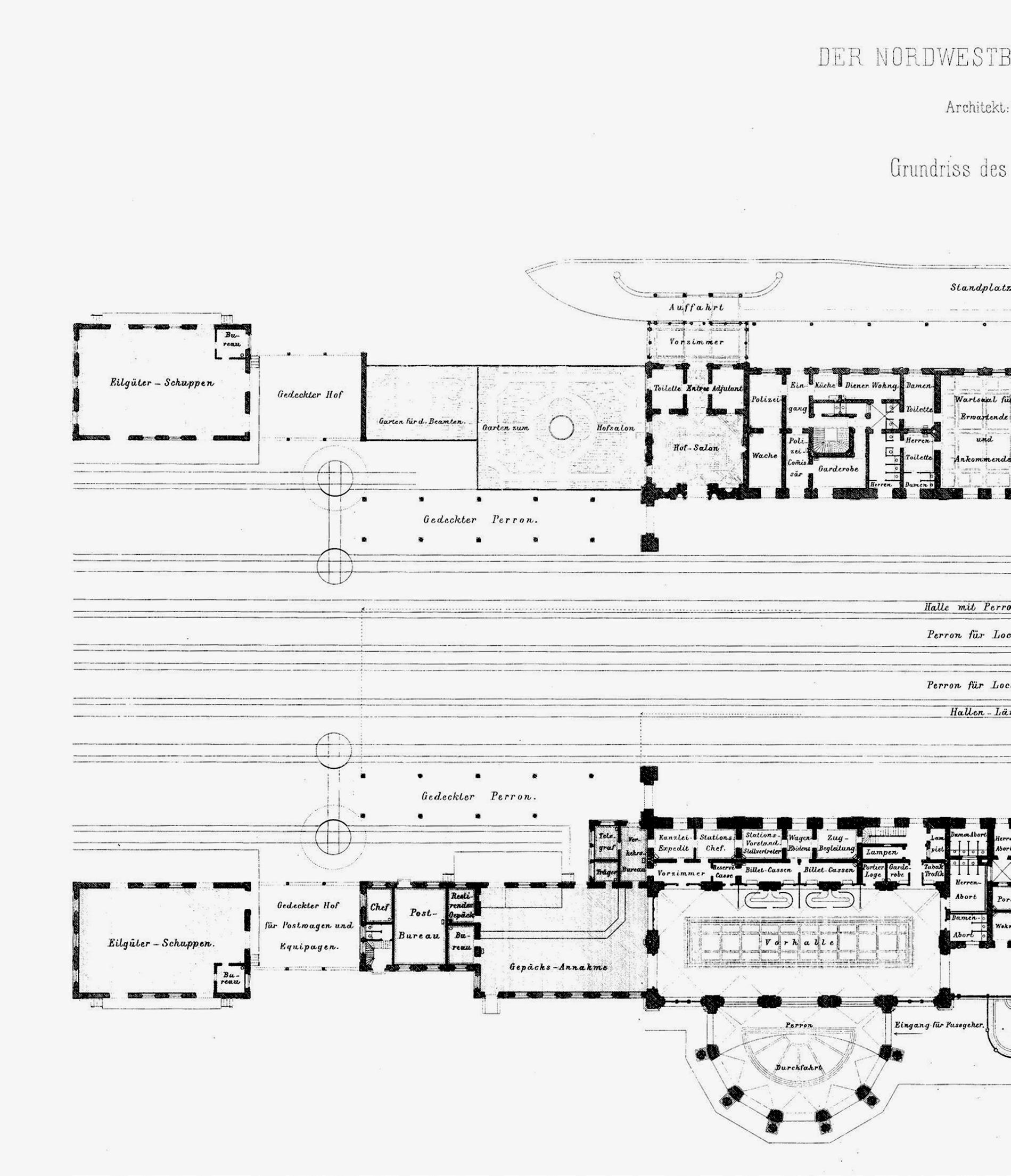 Das Personenabfertigungsgebäude des Nordwestbahnhofs, Grundriss Erdgeschoß; Zeichnung: Wilhelm S . Bäumer, 1873; ÖNB Bildarchiv Austria