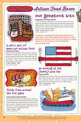FoOds from arOund the five lakes Great Lakes Artisan Gift Box Peanut Butter from Koeze in Grand Rapids, Strawberry and Pepper Jam from Farrell Fruit in Ann Arbor, Freshly Roasted Zingerman's Coffee, Mo’s Bacon Chocolate bar from Vosges in Chicago, Marieke Gouda from Thorp, Wisconsin, Nueske’s Applewood Smoked Bacon from Wisconsin and our Pecan Raisin Bread. G-GLA gift box $100 SHIPS 2 BUSINESS DAY