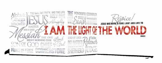 card FeatureS: The names of Jesus are silver-foil stamped with selected names embossed. “I am the Light of the world” is embossed in red foil across the entire three-panel card. When fully opened, the card is easily displayed on a table top or mantle. Actual card size is 7”x 5” (folded). Each pack includes 10 cards, 10 envelopes plus bonus* Zion’s Fire subscription cards. inSide GreetinG: “Rejoice! Jesus was born to give light and life to the world.”