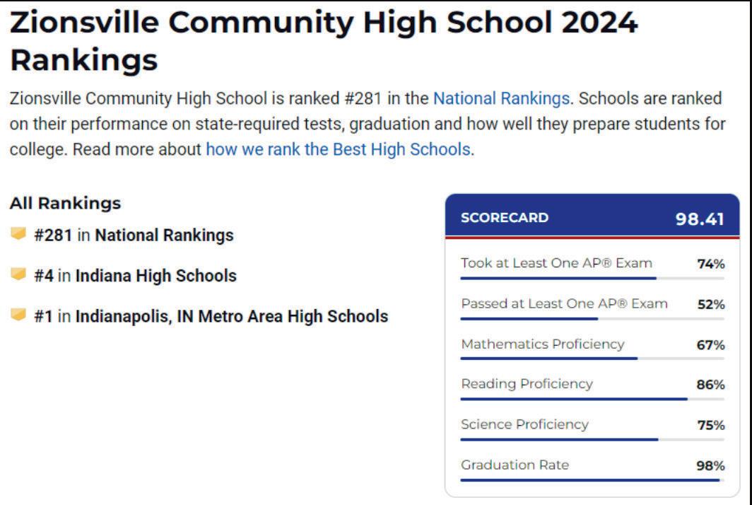 There are roughly 25,000 high schools across the nation reviewed and ranked by U.S. News and World Report. Only the top 17,660 are included in their publicized rankings; schools in the lowest-ranked quartile are concealed. This year, ZCHS has maintained a position near the top of the list at #281 nationally, #4 in Indiana, and #1 in the Indianapolis metro area. U.S. News and World Report rankings rely heavily on percentages of students taking AP/ IB classes and the percentage of students who earn a 3 or higher (passing) score on AP/IB exams.