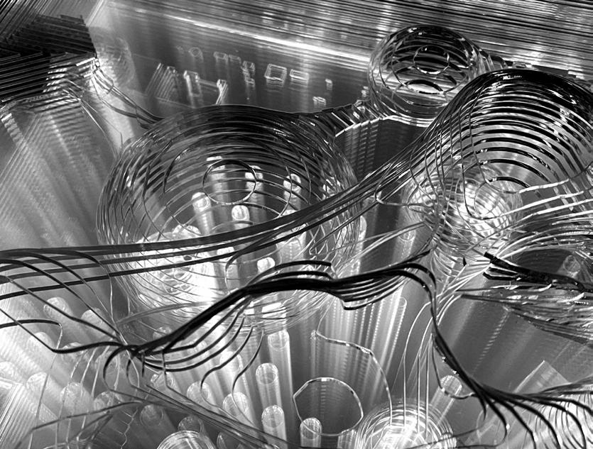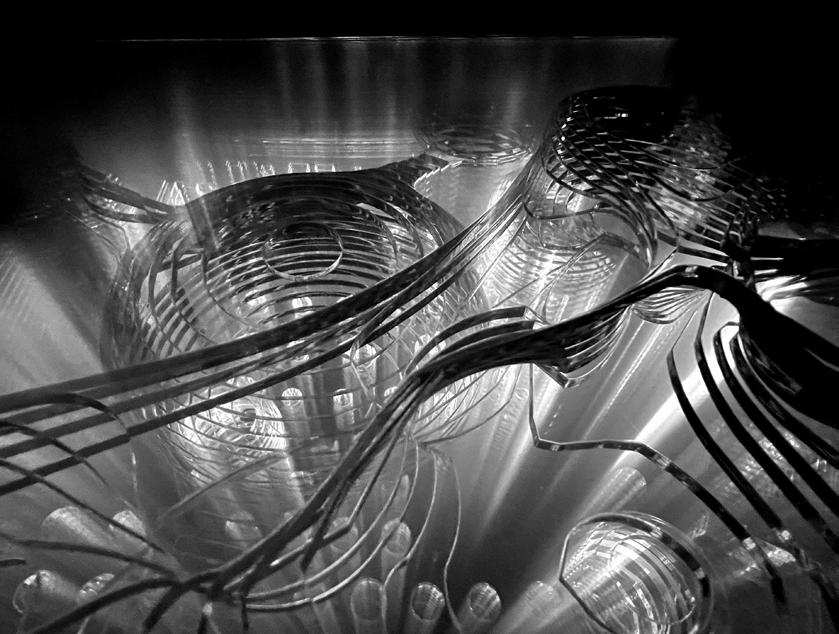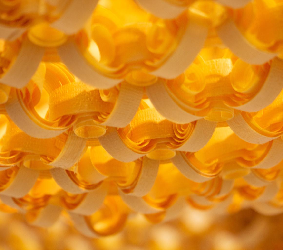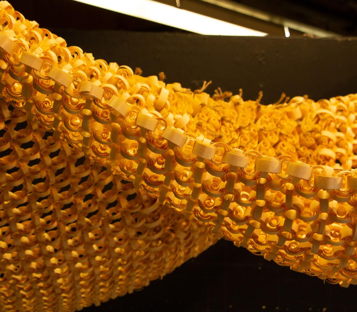At this stage, we need to conduct more in-depth research and a combination of the content in Part A. How can we re-collect, process, and utilize waste from normal wood production? We took the simplest form - planning wood. This way, we could get the largest possible ultra-thin wood chips from scrap. However, this kind of wood chip does not function at first sight, is not strong enough as a structure, and cannot be stretched as a rope. But it also has advantages, such as light and flexible material. Therefore, we can get many different forms by changing the connection and arrangement of coils. The addition of crushed wood chips enhances the structure of this form. After doing a lot of material studios, we found the most suitable form for our group’s topic tension and displayed it in the form of an installation.