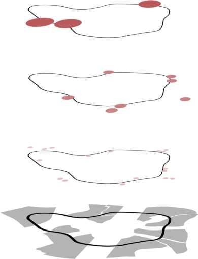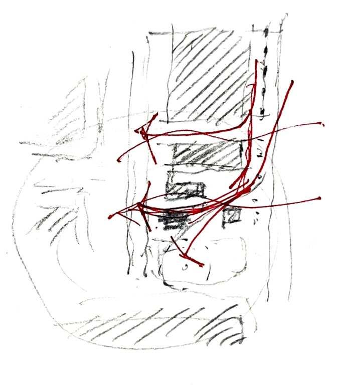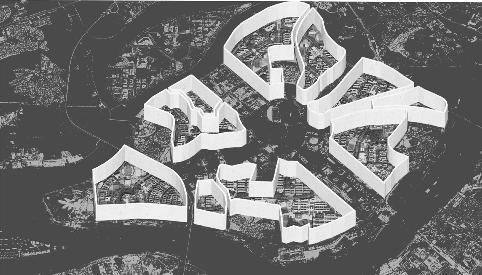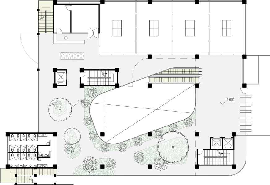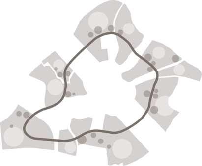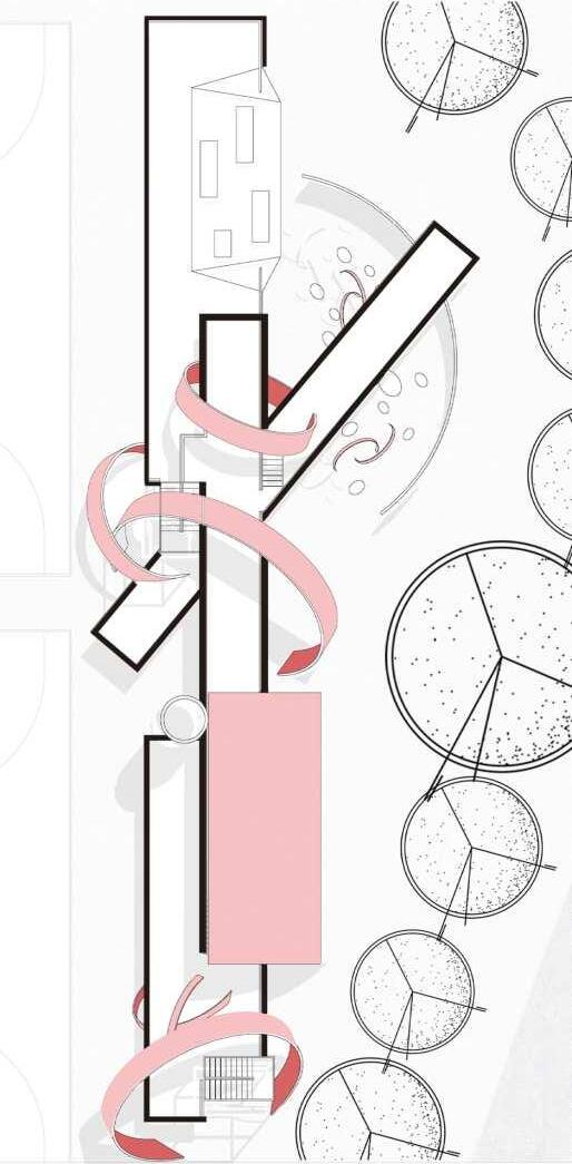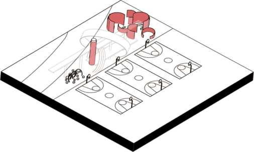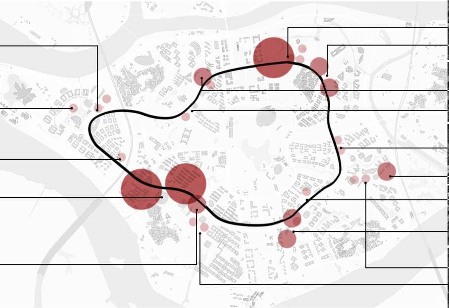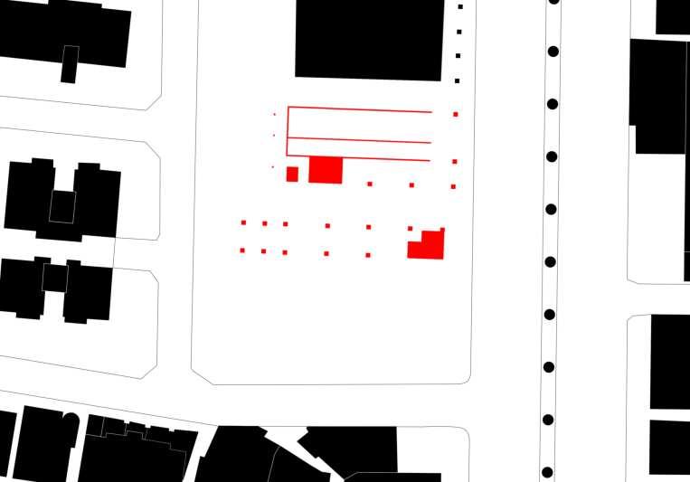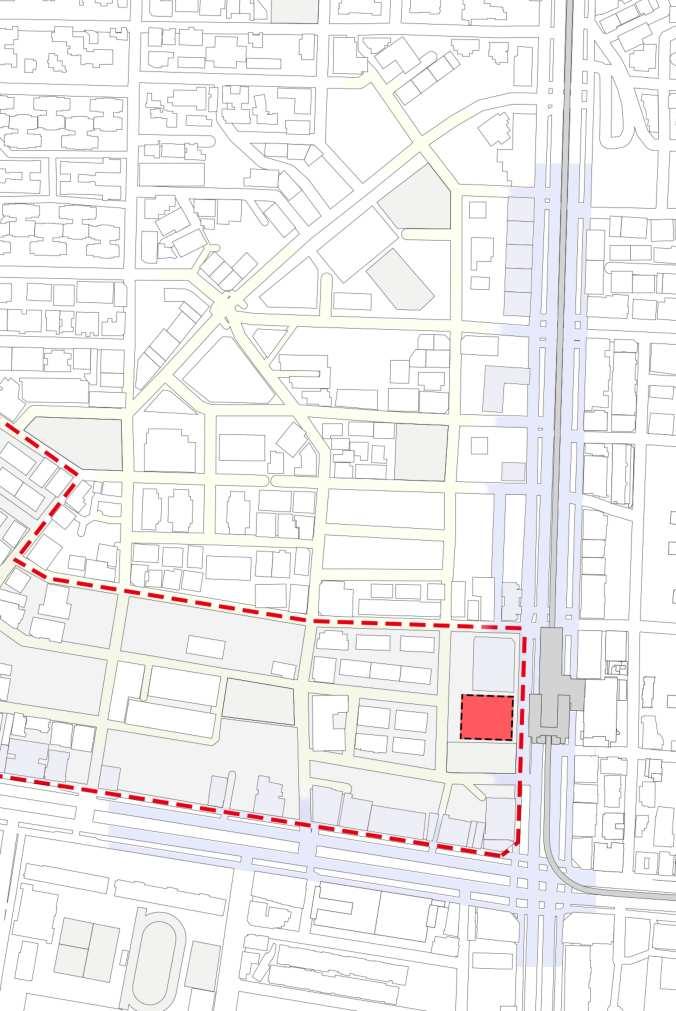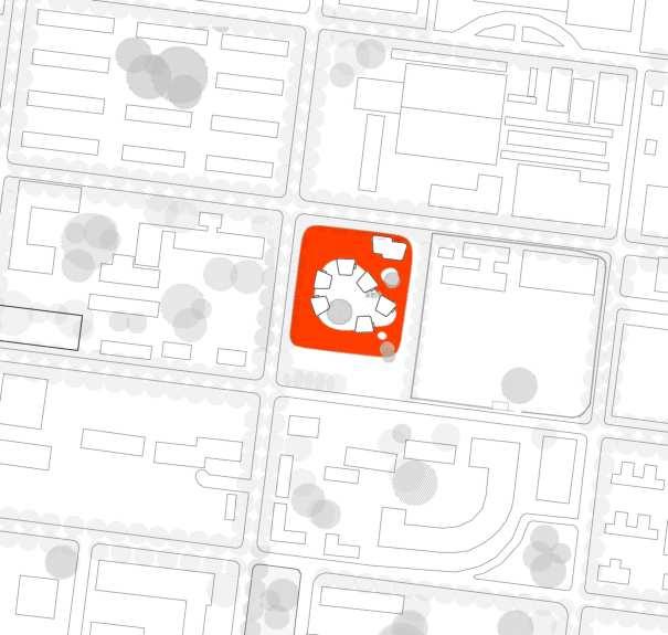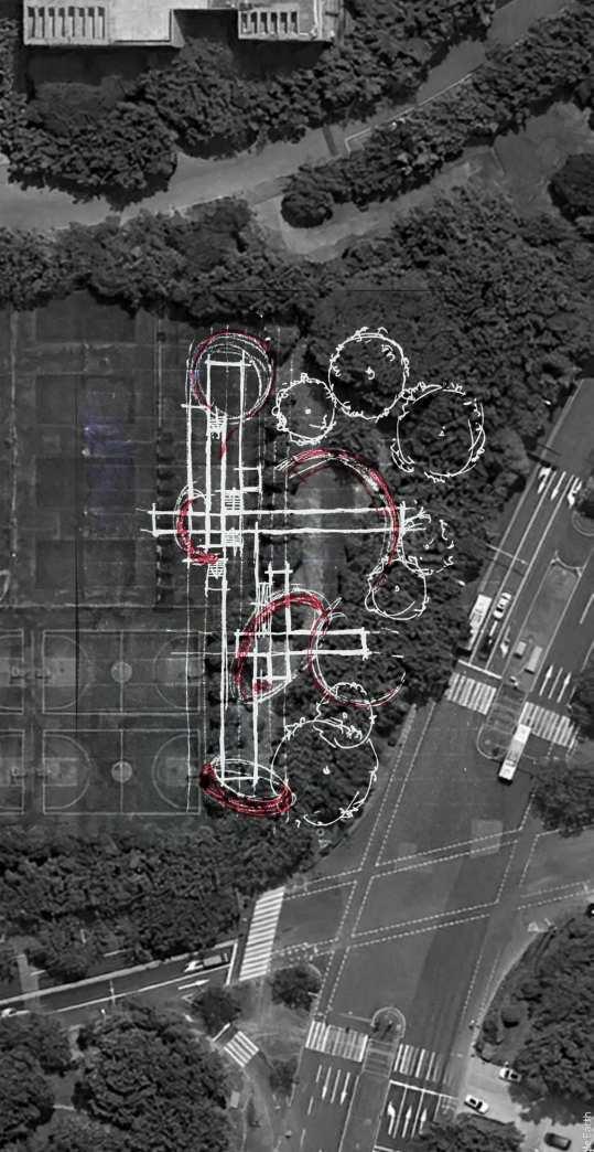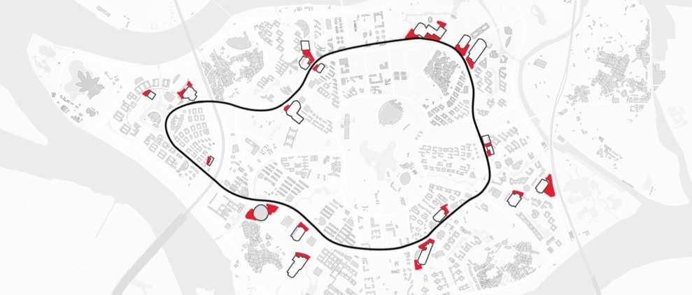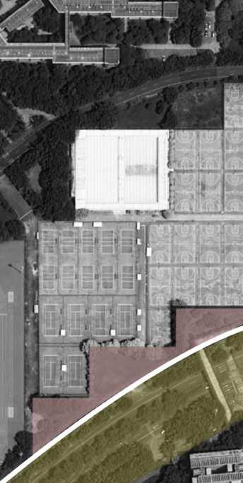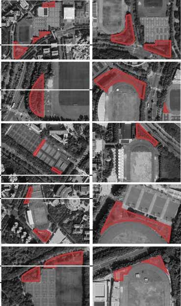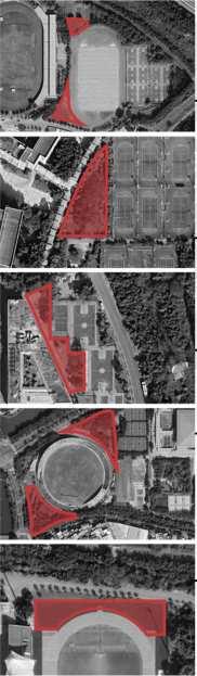 当方形运动场的规划逼近中环路时,边界上会留下很多放 不下运动场但面积很大的区域。这些广阔的空地可以作为 设计介入的场地。